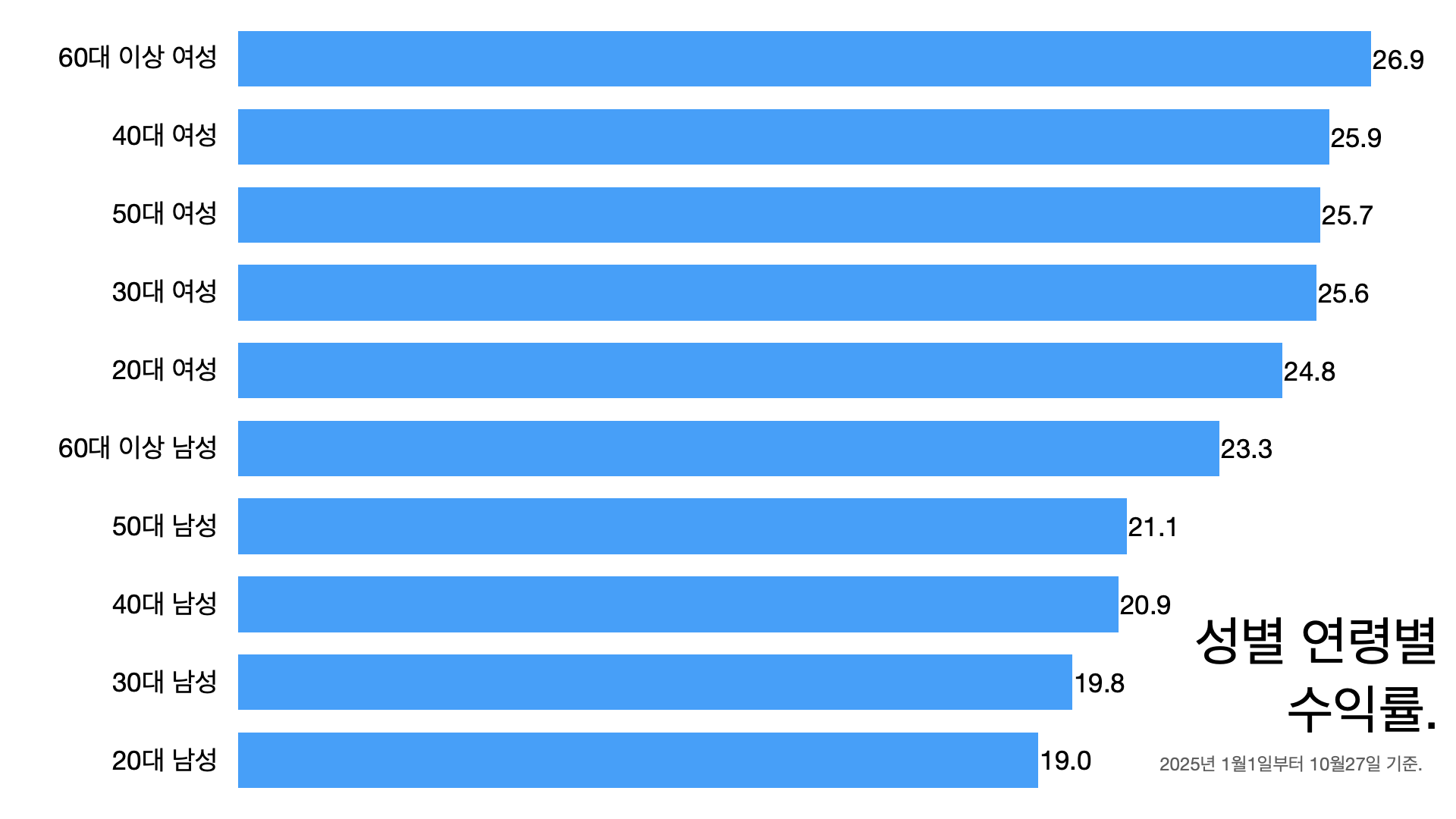 - 회전율 차이도 컸다. 남성은 평균 181%, 여성은 86%였다. 장기 상승 국면에서는 자주 사고팔수록 이익 구간을 놓치기 쉽다.