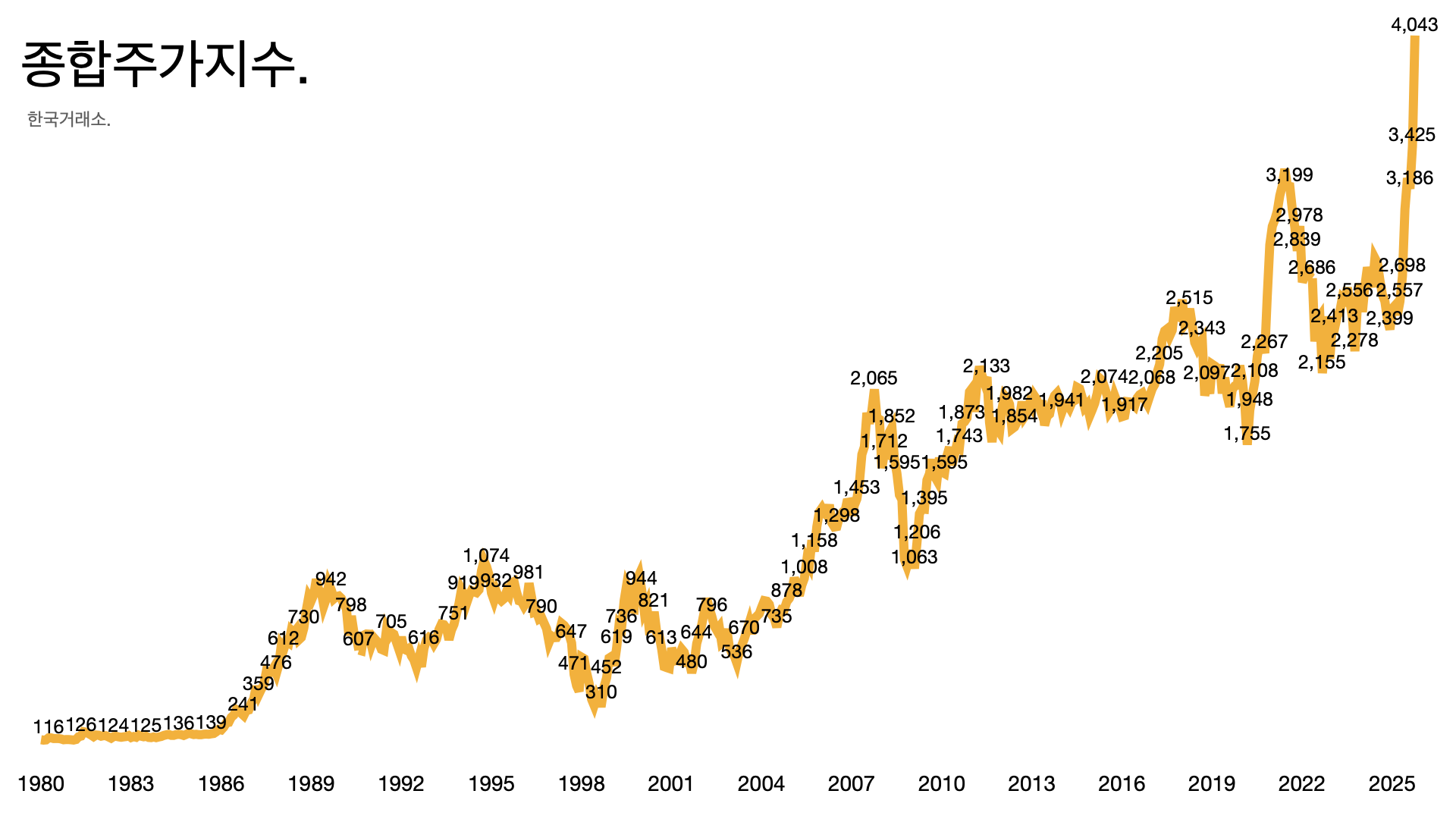 - 고질적인 코리아 디스카운트를 넘어 코리아 프리미엄으로 구조적 전환에 들어섰다는 평가도 나온다. 45년 만에 40배가 올랐다.