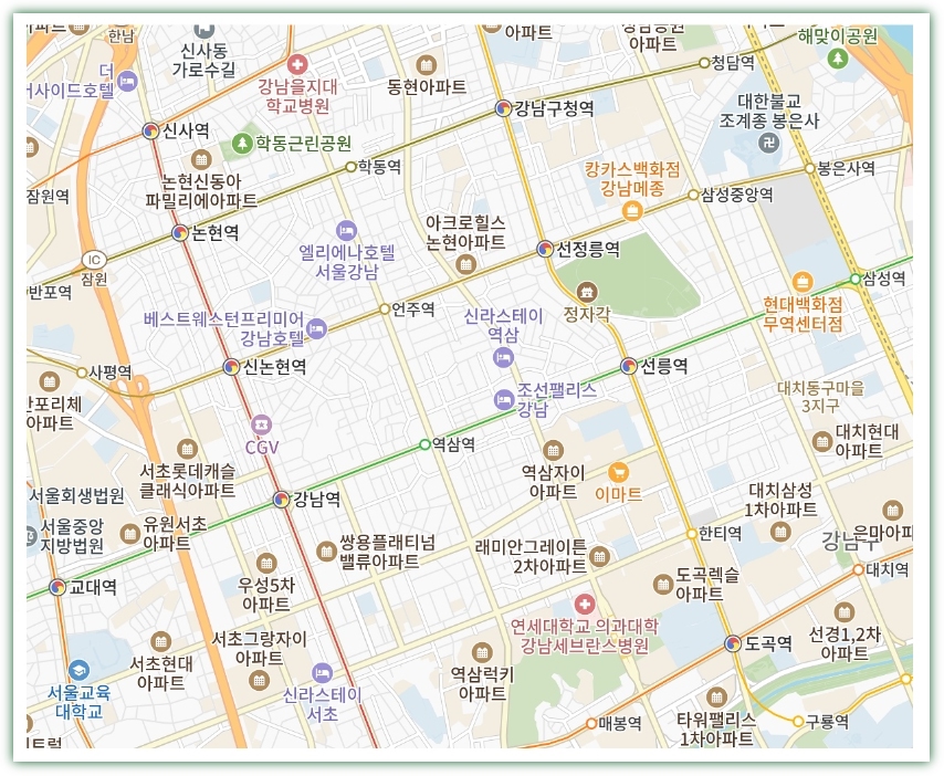 공항을 이전하든, 그린벨트를 풀든, ‘1급지’ 주변에 ‘1.5급지’를 더 많이 만들기 위해서는 기반 시설에 투자해야 한다. 안 그러면 폭동이 난다. 실제로 그랬다(위 사진 참고). 그런데 그렇게 투자하고 나면, 그 사이에 1급지는 특급지가 될 것이다. 실제로 그랬다. 현재의 강남이 1급지가 된 이유는 학군도 있지만, 기반 시설에 대한 공공투자가 계속되었기 때문이기도 하다. 그 결과 강남은 사거리 2개마다 역세권이다(아래 지도 참고).