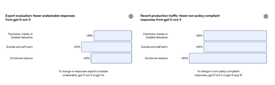 모델의 안전 장치를 더욱 강화하고 사람들이 ChatGPT를 어떻게 사용하는지 이해하기 위해, 오픈AI는 몇 가지 관심 영역을 정의하고 그 크기와 관련 모델 동작을 정량화했다. 이 세 가지 영역 각각에서 프로덕션 트래픽, 자동 평가, 그리고 독립적인 정신 건강 임상의가 평가한 결과에서 모델 동작이 크게 개선되는 것을 확인했다고 한다.