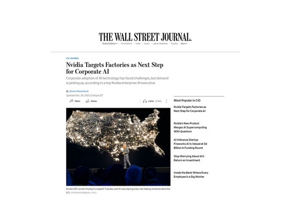 지난주는 모든 뉴스가 한국을 향했다. APEC과 젠슨 황이 국내에서 벌인 다양한 활동, 특히 국내 기업과의 협력 제시 덕분이다. 그러나 엔비디아는 워싱턴 GTC(GPU Technology Conference)에서 더 많은 발표를 쏟아냈다. 한국 기업과의 협력도 엔비디아의 거시 전략하에서 해석해야 한다. 그런 맥락에서 엔비디아 다음 목표가 ‘AI 팩토리’라는 월스트리트저널 기사가 확 눈에 들어왔다.