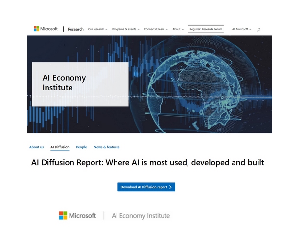 AIEI(AI Economy Institute)는 마이크로소프트가 설립한 싱크탱크로, AI가 경제·교육·노동에 미치는 영향을 연구하고 정책 제안을 하는 기관이다. 이번에 발간한 보고서는 AI를 가장 많이 사용하고, 개발하고, 구축하는 곳이 어디인지를 살펴보는 보고서이다.