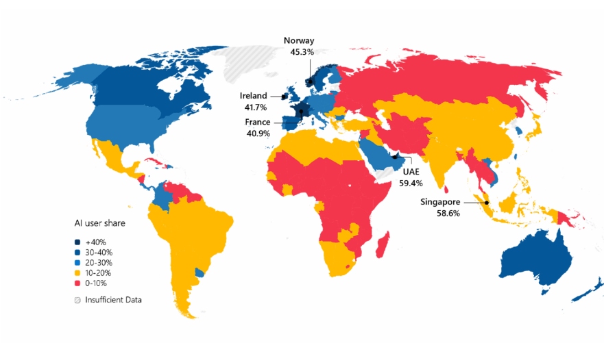 AI는 차세대 범용 기술이며, 인류 역사상 가장 빠르게 확산되고 있는 기술이라고 평가하면서, 이전의 다른 범용 기술과 마찬가지로, 그 혜택이 고르게 확산되지는 않고 있음을 밝힌다. 북반구의 AI 사용률은 남반구의 약 두 배에 달하는데, 집중적인 노력이 없다면, 이러한 격차는 향후 수십 년 동안 AI의 혜택을 누가 누릴지 결정짓는 요소가 될 것이라고 본다.