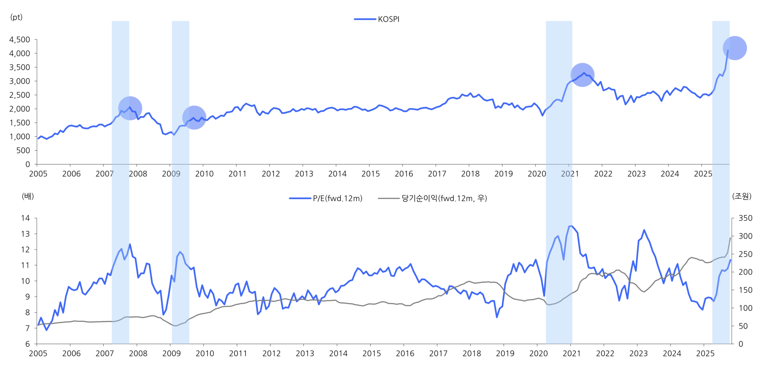 - 1980년 중반 3저 호황이나 1990년 후반 IT 버블 때와 비슷하다는 분석도 나온다. 지금은 펀더멘털롸 밸류에이션이 동시에 개선되는 국면이다. 이익과 PER이 동시에 오를 때 주가가 오른다.