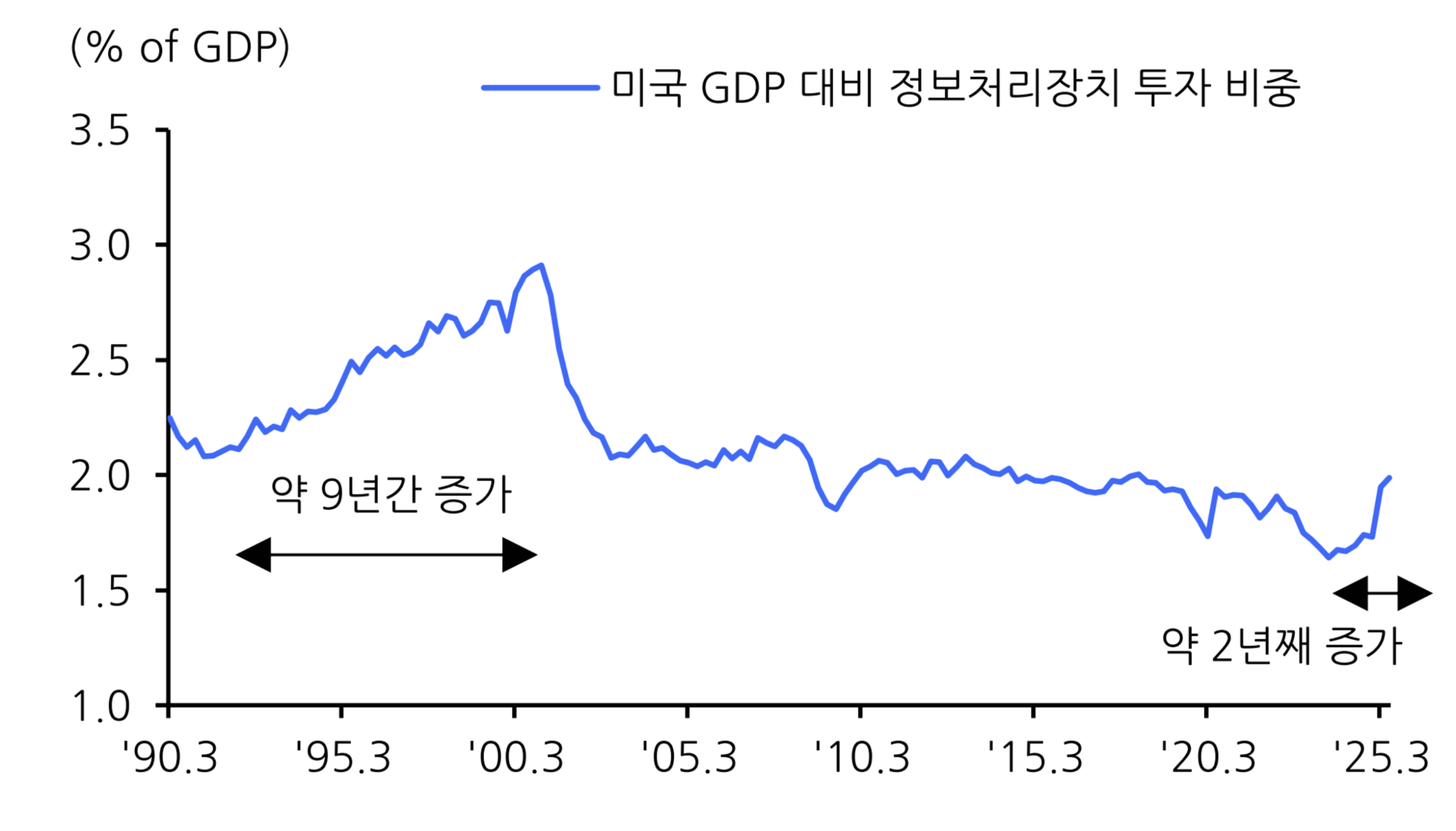 - GDP 대비 IT 투자가 1991년 2.0%에서 2000년 2.9%로 늘었는데 지금은 2023년 1.6%에서 2025년 2.0%로 늘었을 뿐이다. 게다가 아직 인프라 투자는 시작도 하지 않은 상황이다.