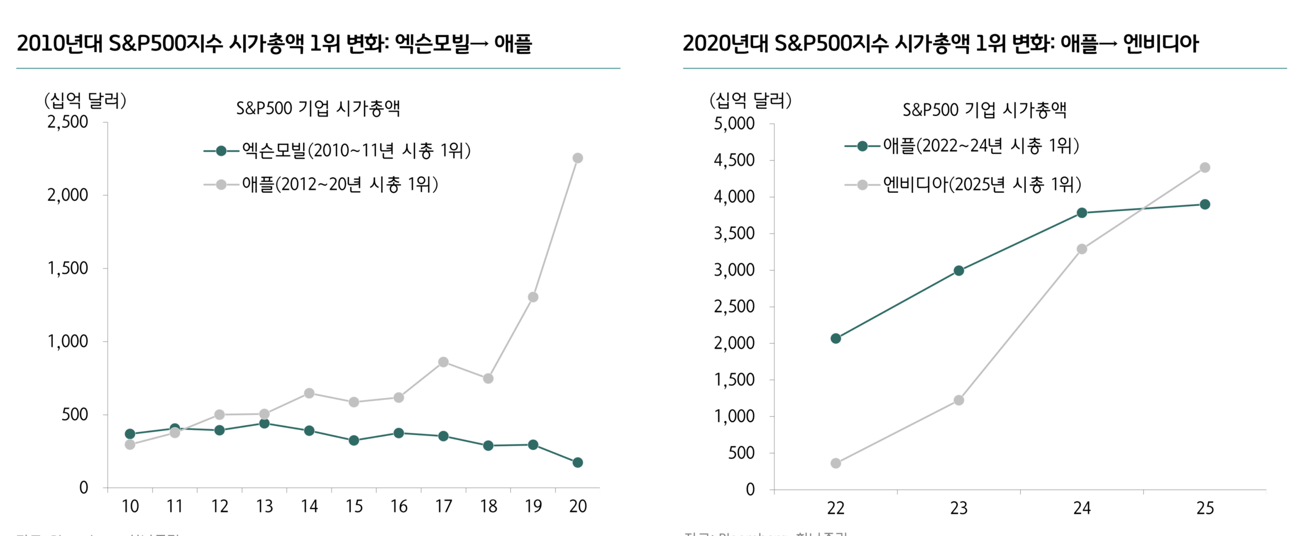 - 시가총액 1위 기업이 엑슨모빌에서 애플로, 다시 엔비디아로 바뀌는 과정을 보자. 에너지에서 B2C로, B2B로 리레이팅하는 과정이다.