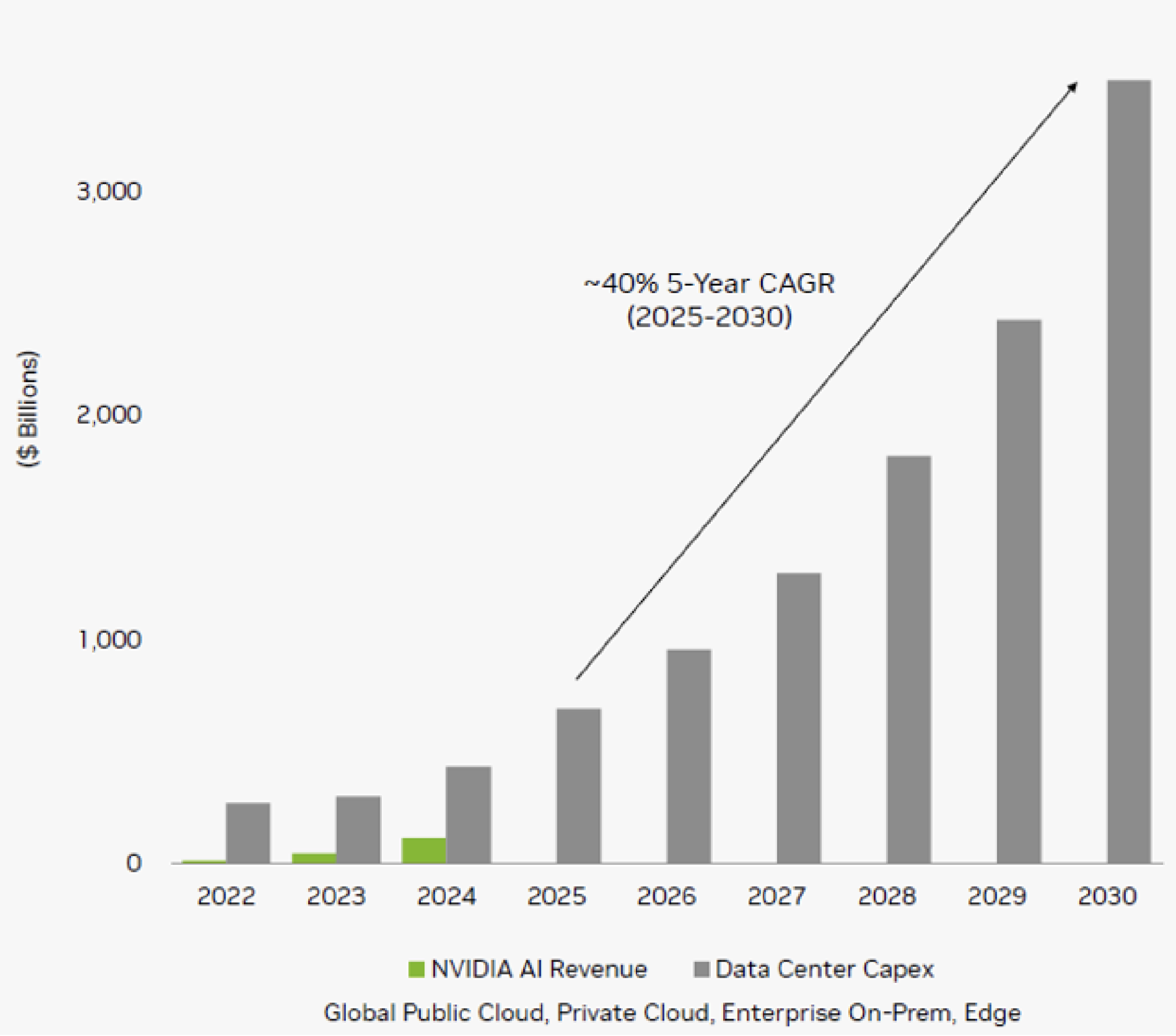 - AI 황금광 시대에 반도체는 청바지 장수가 아니라 곡괭이 장수에 가깝다. 청바지는 없어도 되지만 곡괭이는 없으면 금을 캘 수 없다. 투자가 늘면 반도체 수요도 늘어난다. 엔비디아는 2030년까지 해마다 40% 이상 데이터 센터 투자가 늘어날 거라고 보고 있다.