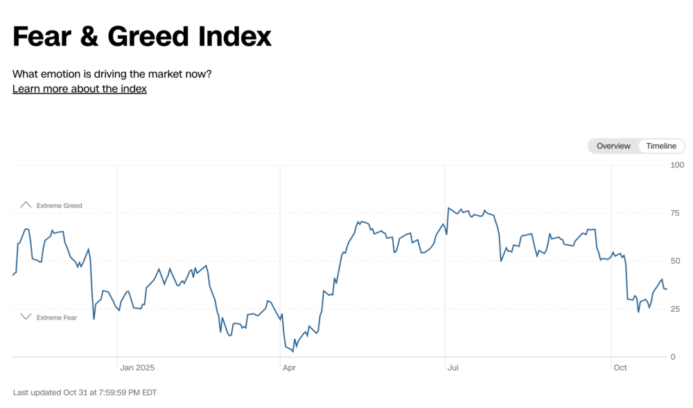 - CNN에서 집계하는 공포와 탐욕 지수라는 게 있다. 60을 넘으면 탐욕 구간이라고 보고 40을 밑돌면 공포 구간이라고 보는데 10월31일 기준으로 35를 기록하고 있다. 주가가 너무 올랐다는 인식이 퍼지고 있다는 이야기다.