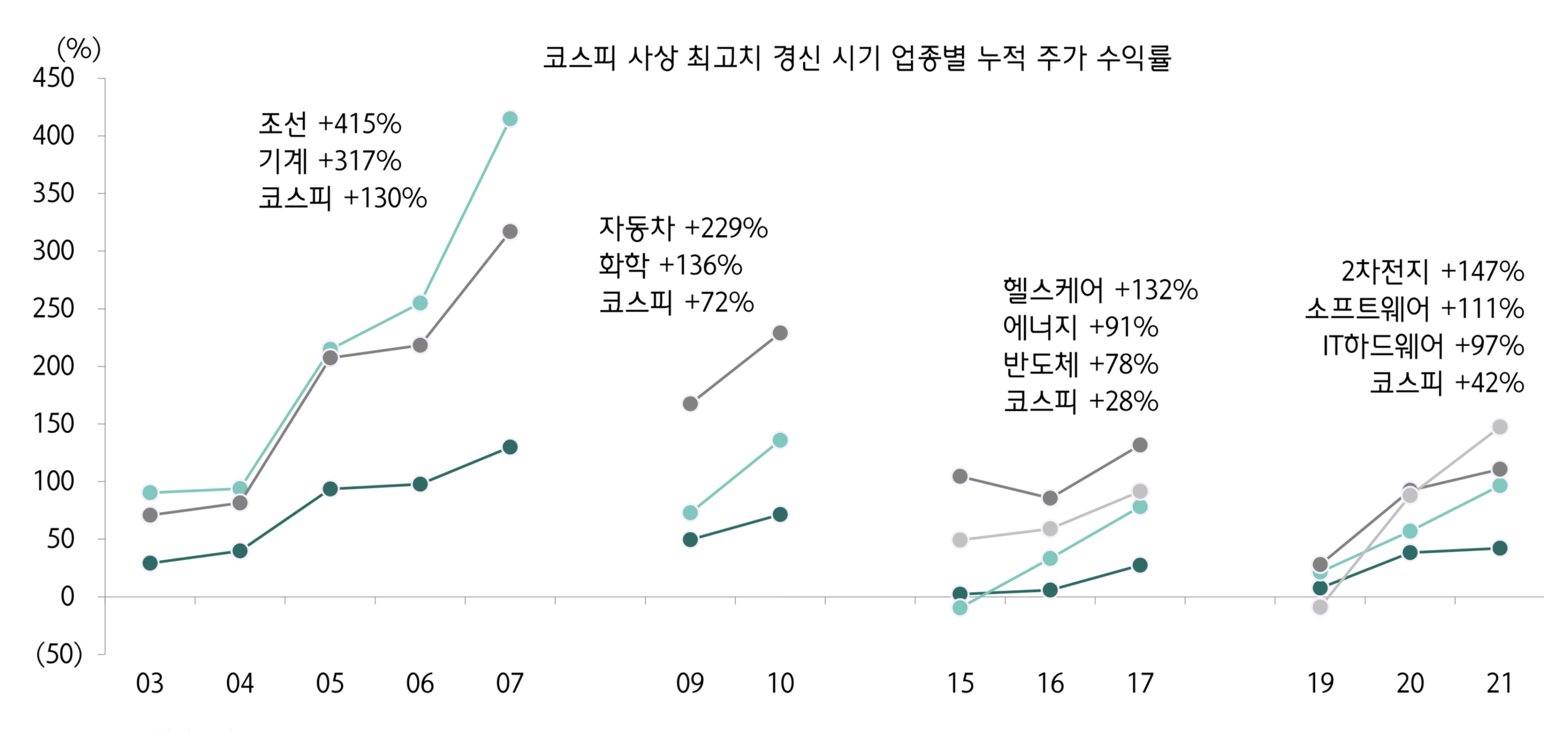 - 주도주가 끝까지 간다. 2003~2007년 피크를 칠 때는 조선과 기계 업종이 주도했다.