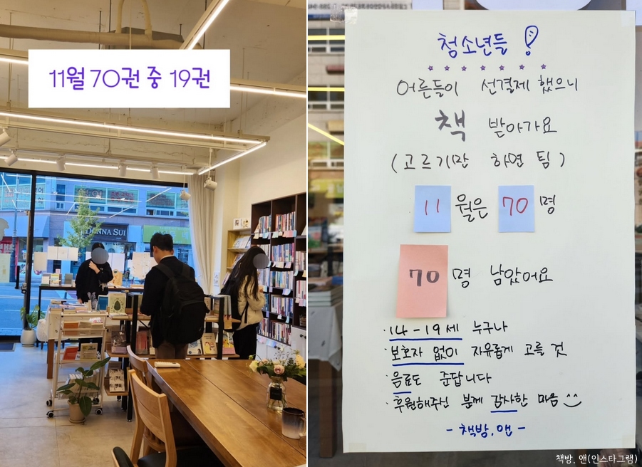- 충북 청주시의 독립서점 ‘책방, 앤’의 실험이다. 달마다 30권 정도를 단골손님들이 미리 결제하고 지나가던 청소년들이 무료로 받아 갈 수 있게 했다.