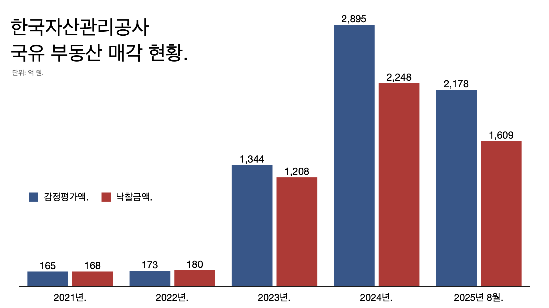- 지난해 내다 판 국유 부동산 795건의 감정 평가액이 2895억 원이었는데 실제 낙찰 금액은 2248억원이었다. 647억 원을 손해 보고 팔았다는 이야기다.