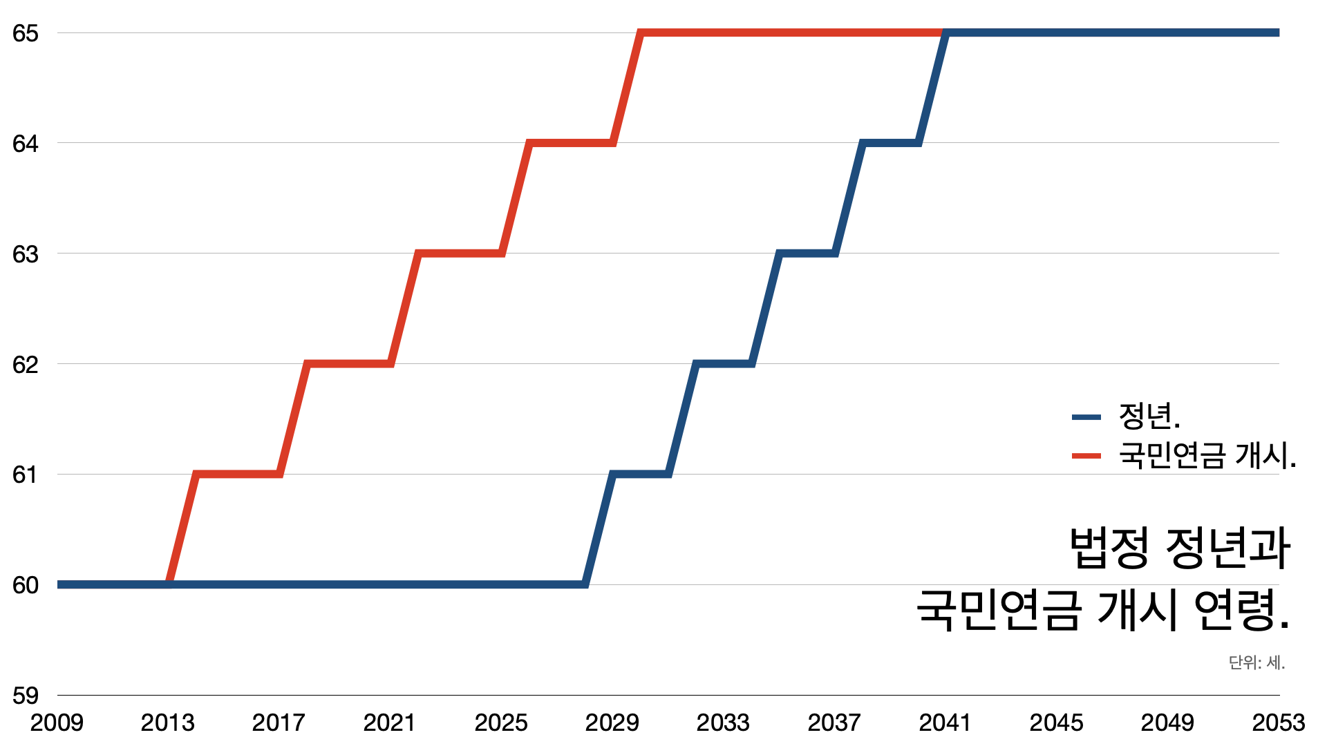- 2033년부터 국민연금 수급 개시 연령이 63세에서 65세로 늦춰진다. 정년을 연장해야 소득 공백을 줄일 수 있다.