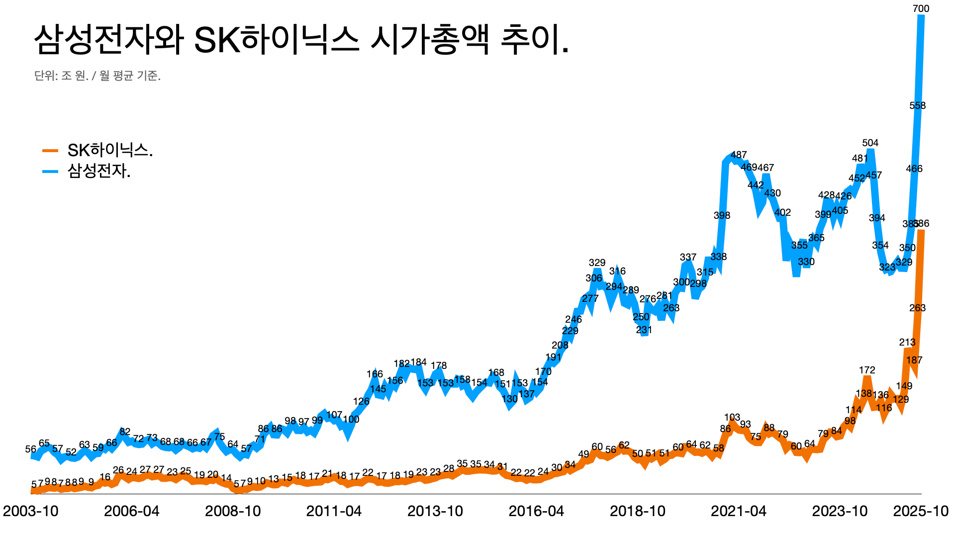 - 삼성전자와 SK하이닉스의 PER은 최근 12개월 실적 기준으로 22배와 17배다.