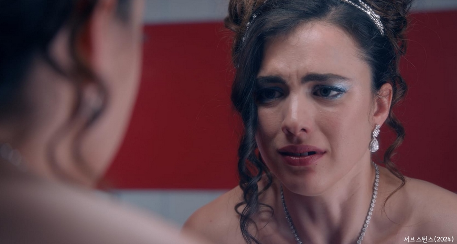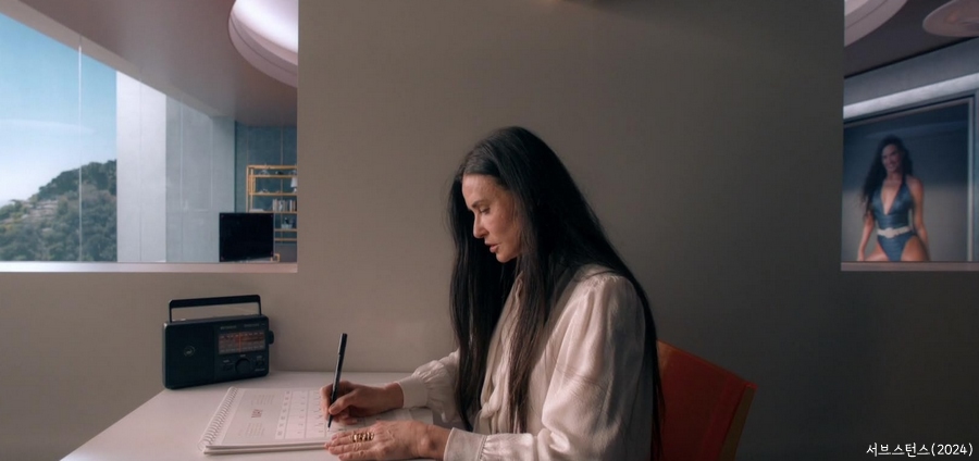 ‘서브스턴스’의 여주인공 엘리자베스 스파크스는 노화한 몸을 거부한다. 그녀는 젊은 육체를 되돌려준다는 ‘물질(the substance)’을 주입받고, 다시 매혹적인 외모를 얻는다. 그러나 그 대가로 그녀는 “자기 자신과의 공존”이라는 지옥을 맞는다 — 젊은 자신과 늙은 자신이 동시에 존재하며 서로를 파괴한다.