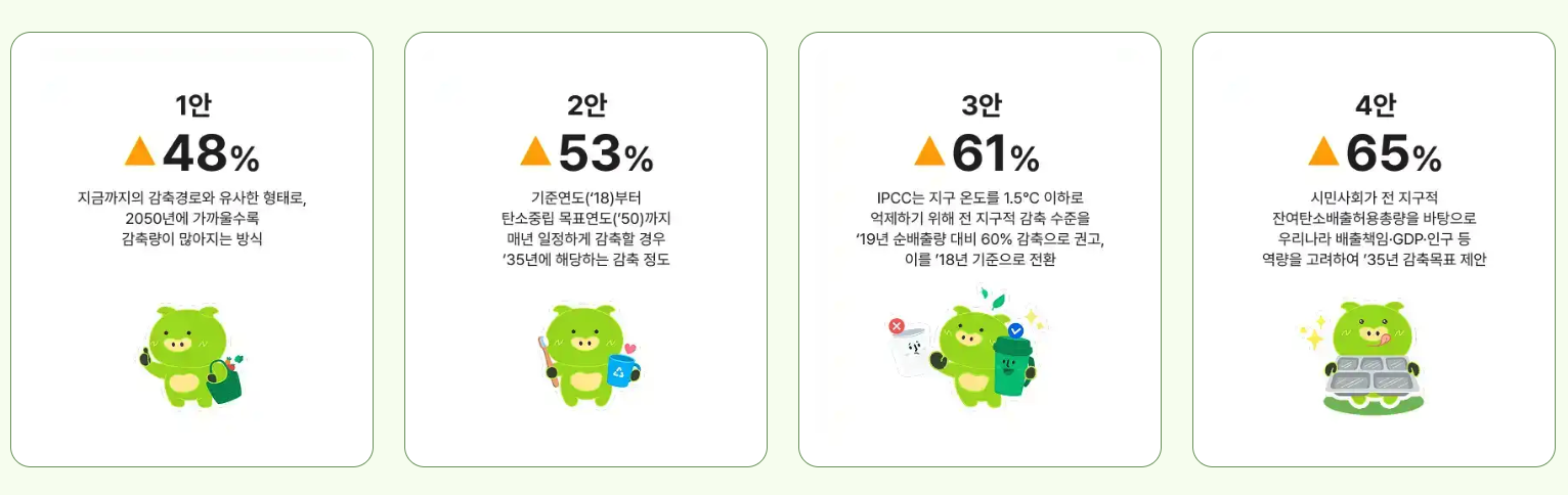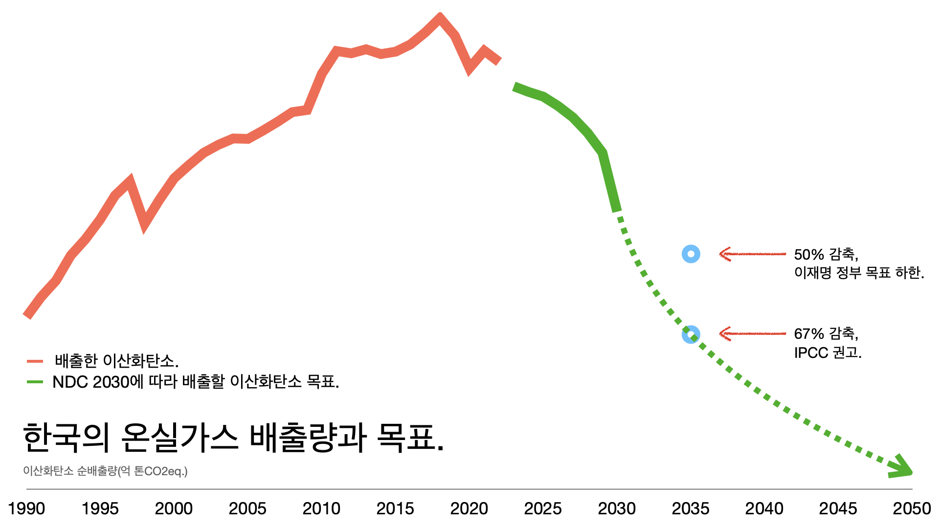 - 파리 협약에 따라 5년마다 10년 목표(NDC)를 UN에 내는데 지금 논의하는 게 2035년 감축 목표다. 최종 목표는 2050년 온실가스 배출을 0으로 만드는 것이다.