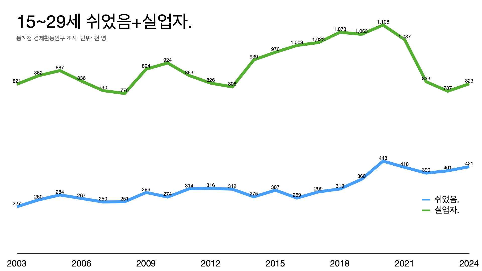 - 2005~2025년 20대 생산가능 인구는 694만 명에서 575만 명으로 17% 줄었는데 쉬었음 인구는 25만 명에서 41만 명으로 64% 늘었다.