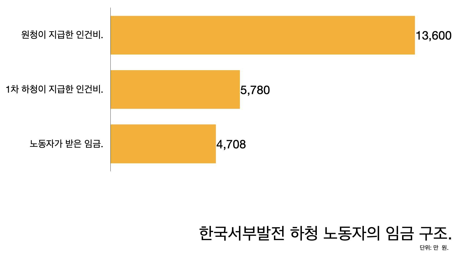 - 고 김충현(태안화력발전소 하청 노동자)의 연봉은 4708만 원이었다. 그런데 실제로 한국서부발전(원청)이 한전KPS(1차 하청)에게 지급한 인건비는 1인당 1억3600만 원이었다.