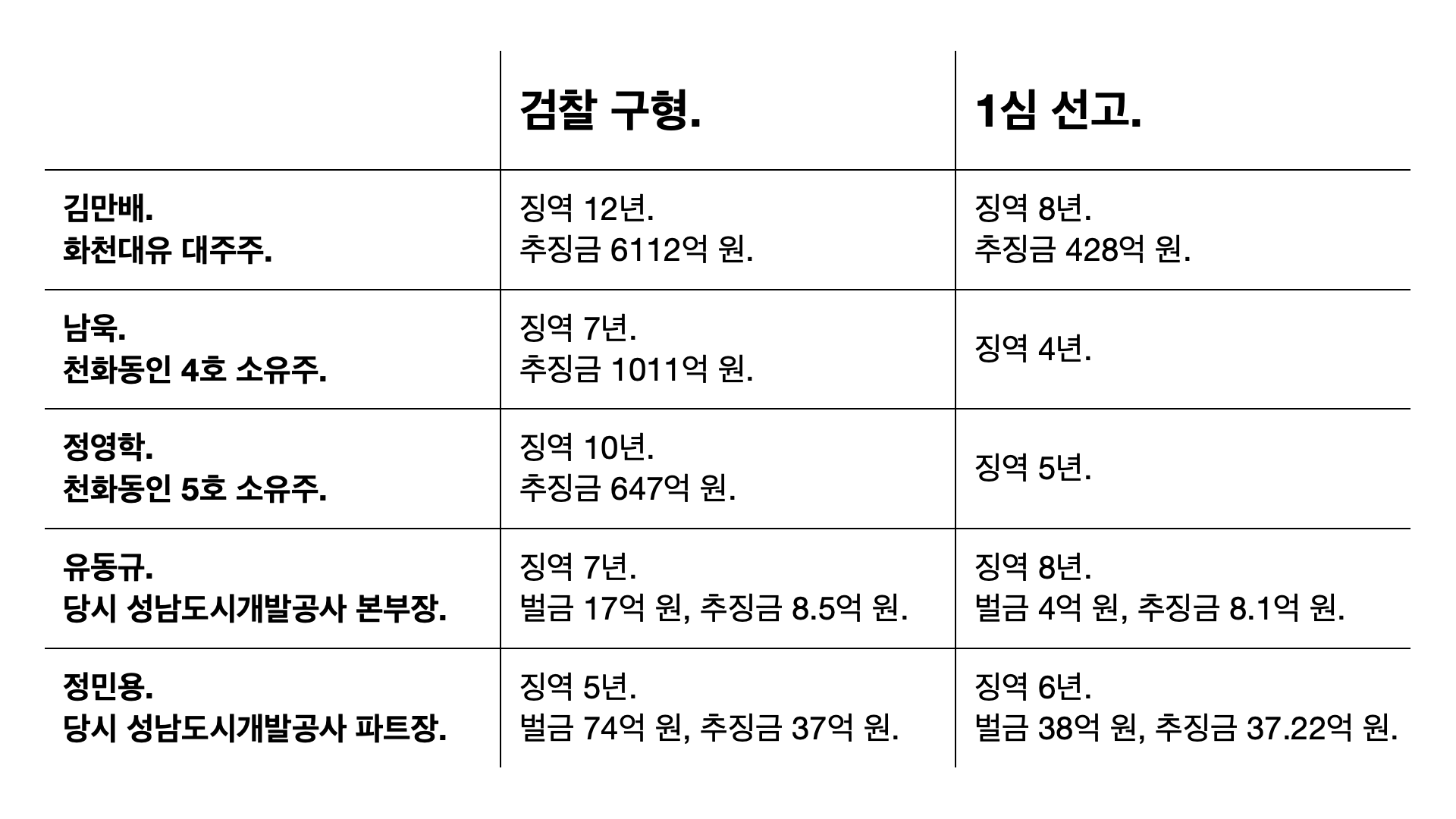 - 유동규는 검찰이 징역 7년을 요구했는데 8년으로 늘었다. 정민용도 검찰이 징역 5년을 요구했는데 징역 6년으로 늘었다.
