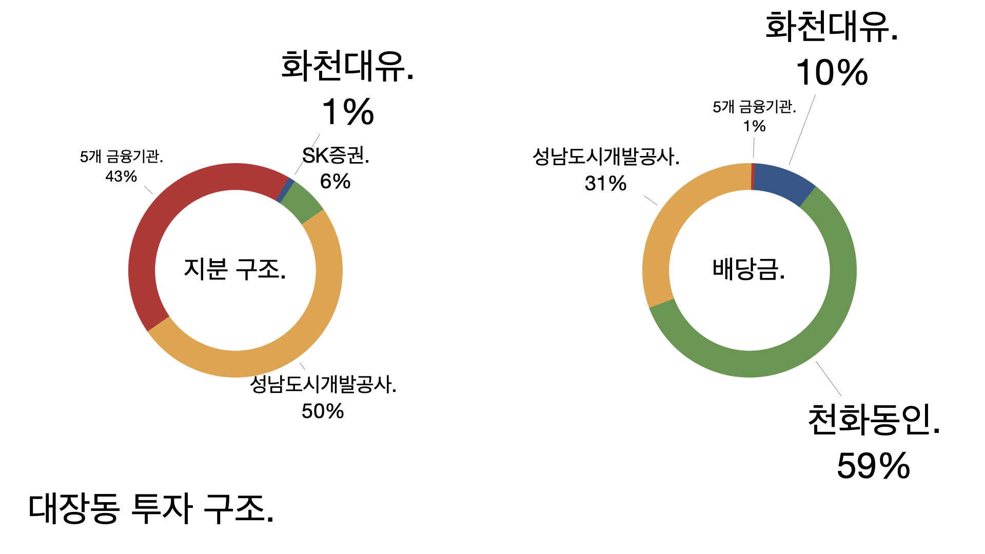 - 화천대유와 천화동인(화천대유 자회사)이 4041억 원을 가져갔고 성남도시개발공사도 1803억 원을 챙겼다.