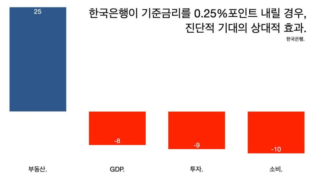 - 기준 금리를 내린 뒤 집값은 더 오르고 GDP와 투자 등은 덜 오른다, 이건 맞는 표현입니다. GDP와 소비가 줄어든다는 건 아니고, 원래 올라야 할 것보다 덜 오른다는 의미입니다.