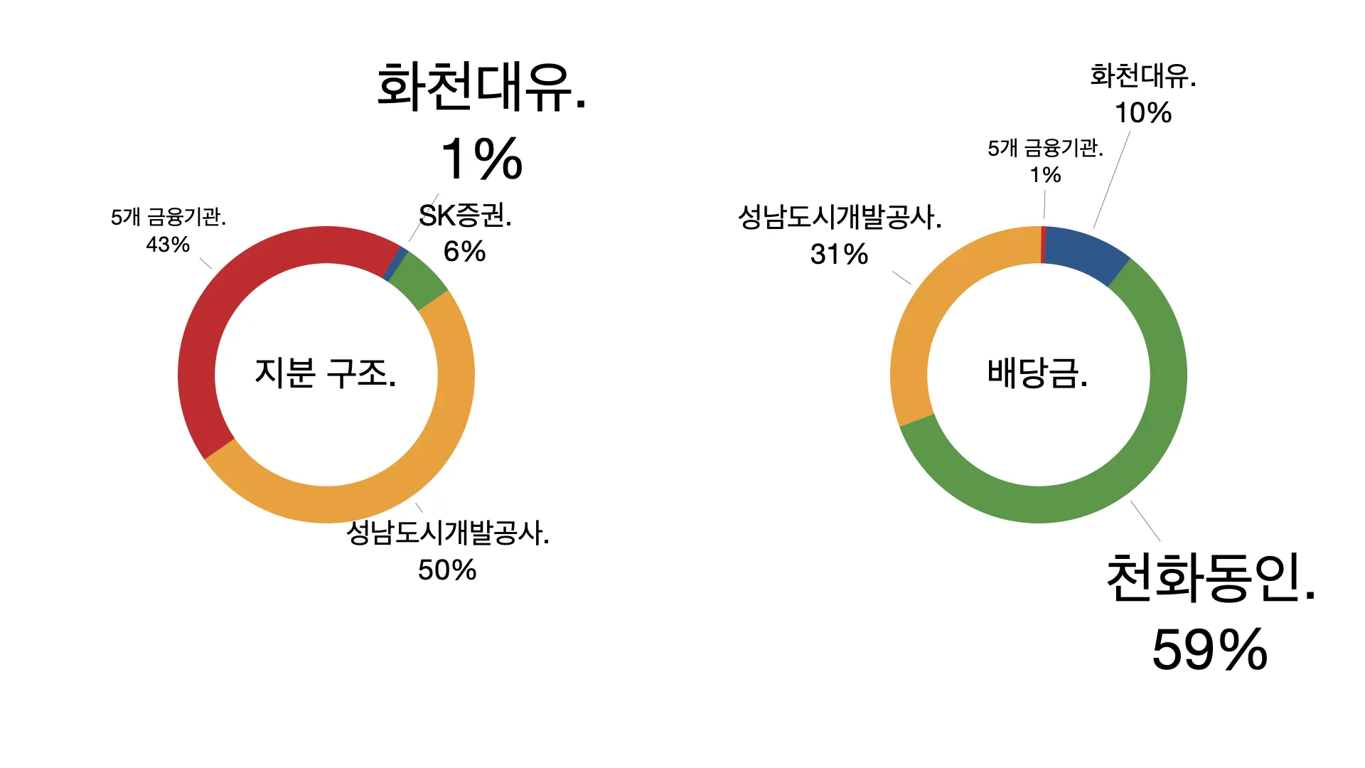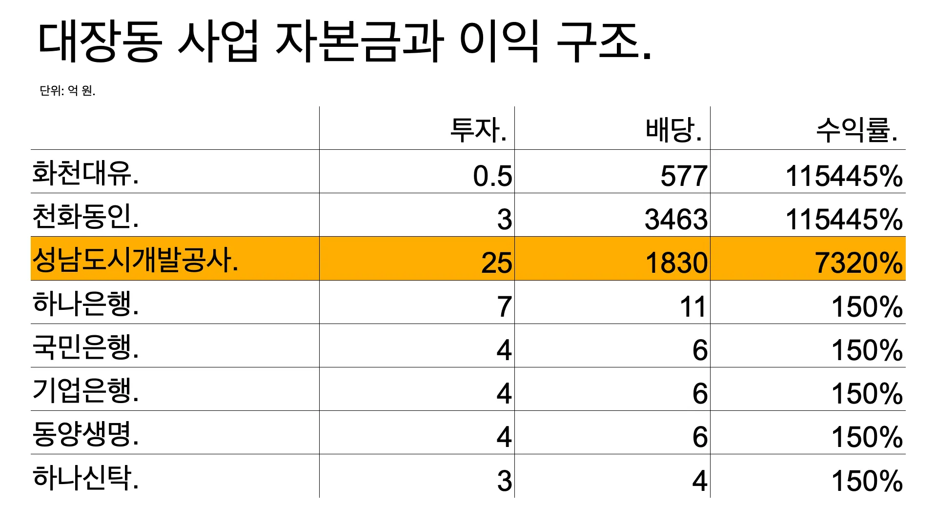 - 첫째, 김만배 일당은 7% 지분으로 69%의 이익을 가져갔습니다. (화천대유 지분은 1%고 SK증권 지분 6%가 화천대유의 자회사 천화동인의 특정금전신탁이었으니 7%라고 봐야 합니다.) 3억5000만 원을 넣고 4004억 원의 배당금을 챙겼죠.