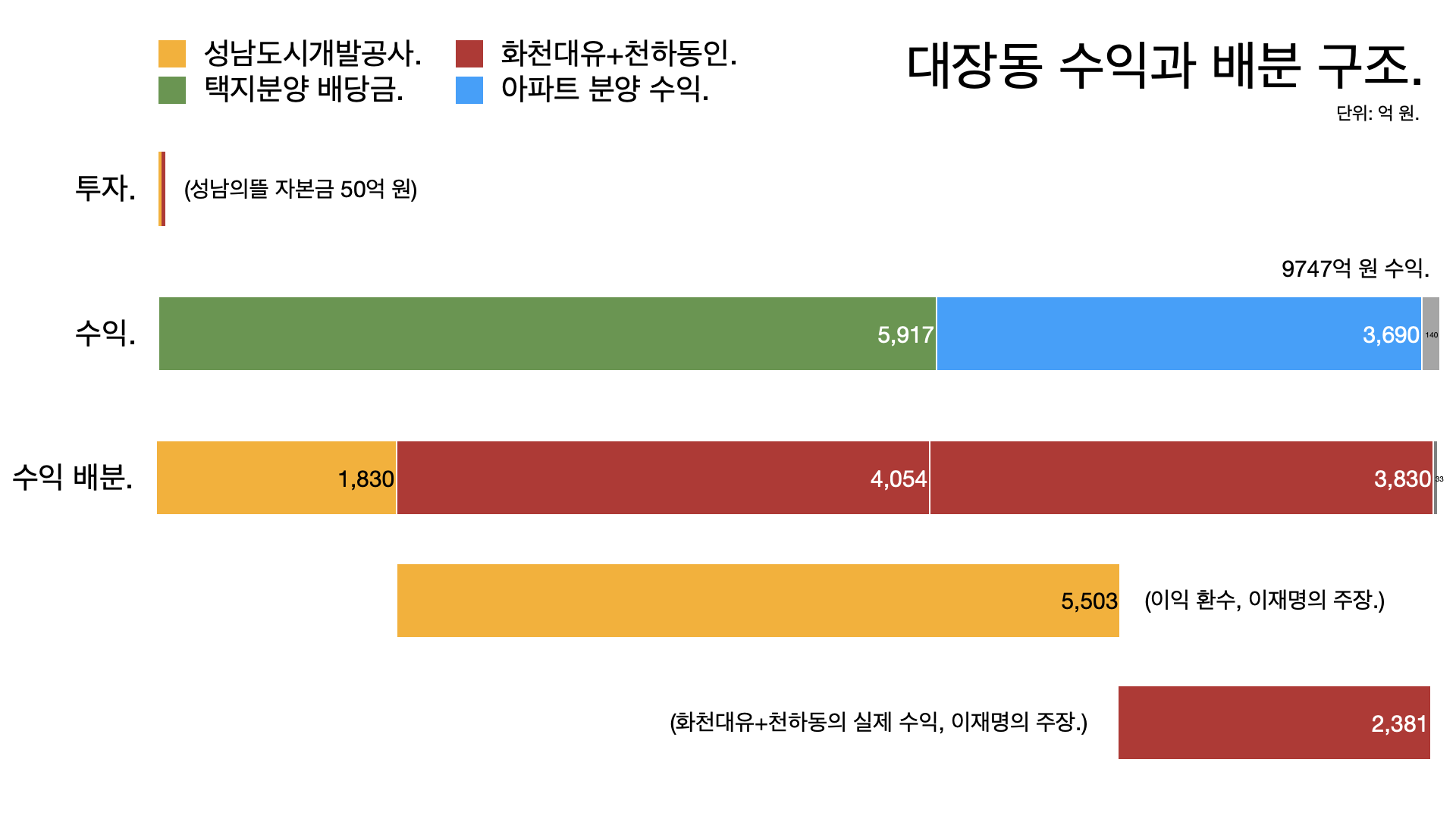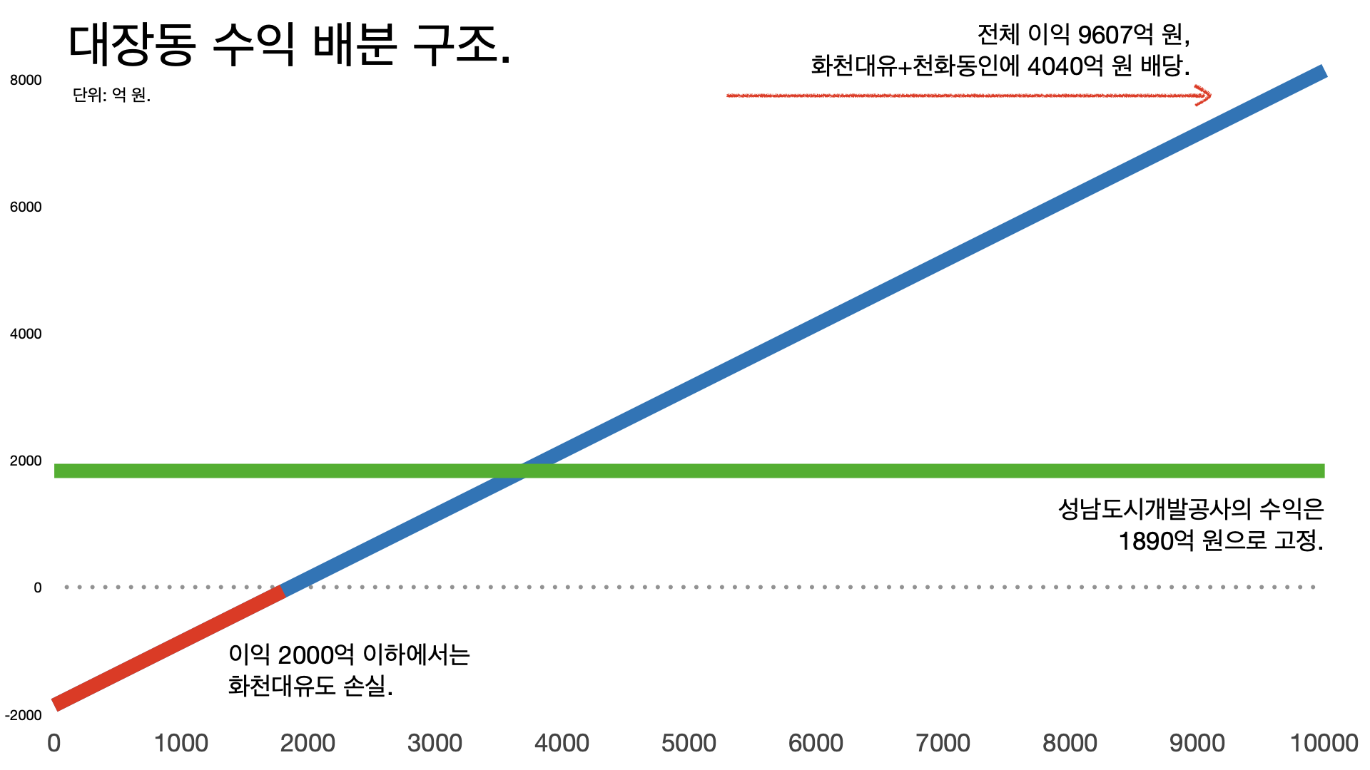 - 어쨌거나 김만배 등이 공공이 단독으로 하기 힘든 사업을 맡아서 택지를 개발하고 분양에 성공해서 작은 도시 하나를 만든 건 사실이죠. 적정 수준을 얼마나 넘겼느냐가 관건입니다.