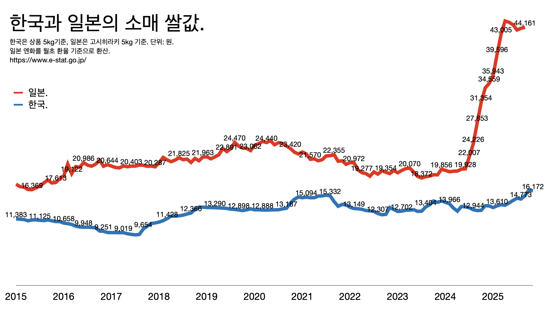 - 한국 돈으로 4만 원이 넘는다. 5kg 기준으로 한국 쌀값이 반값 이하다.