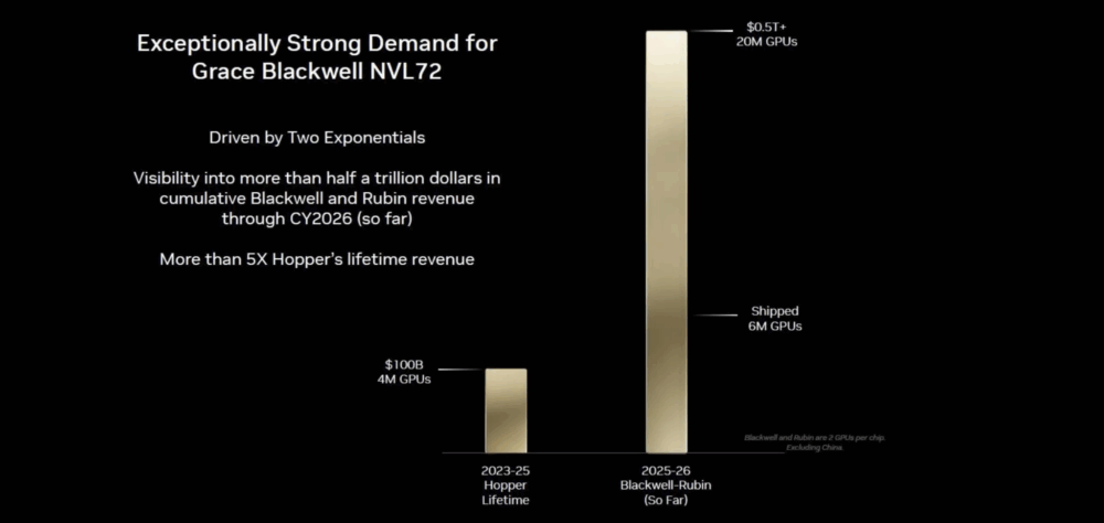 - 2023년부터 팔린 호퍼 칩이 대략 400만 개 1000억 달러 매출인데 올해부터 내년까지 팔릴 블랙웰과 루빈 칩이 2000만 개 5000억 달러 매출을 올릴 거라는 게 엔비디아의 자체 추산이다. 5배 이상 늘어날 거라고 하지만 이미 이런 장밋빛 전망이 주가에 반영돼 있는 상태다.