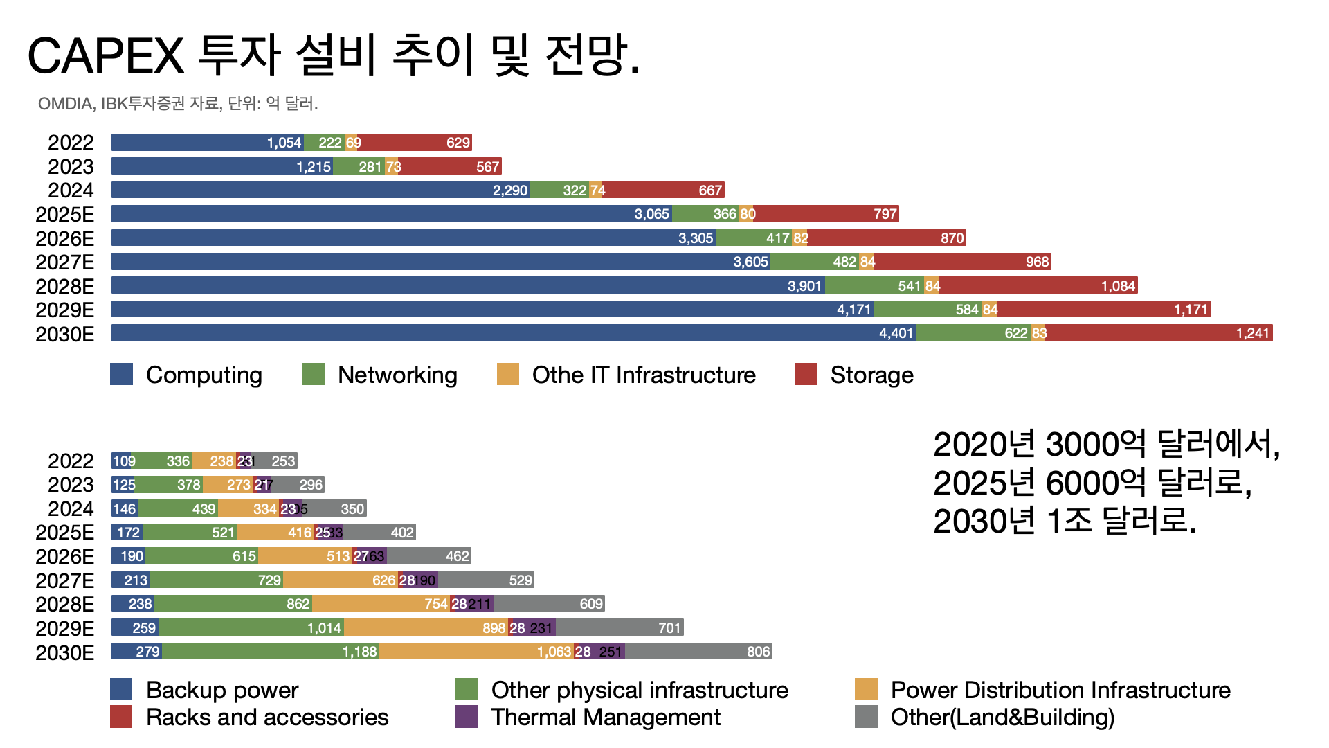 - 세계적으로 AI 관련 설비 투자가 올해 6000억 달러에서 2030년 1조 달러 규모로 늘어날 거라고 하지만 그래도 5조 달러 가치를 설명하기에는 한계가 있다.