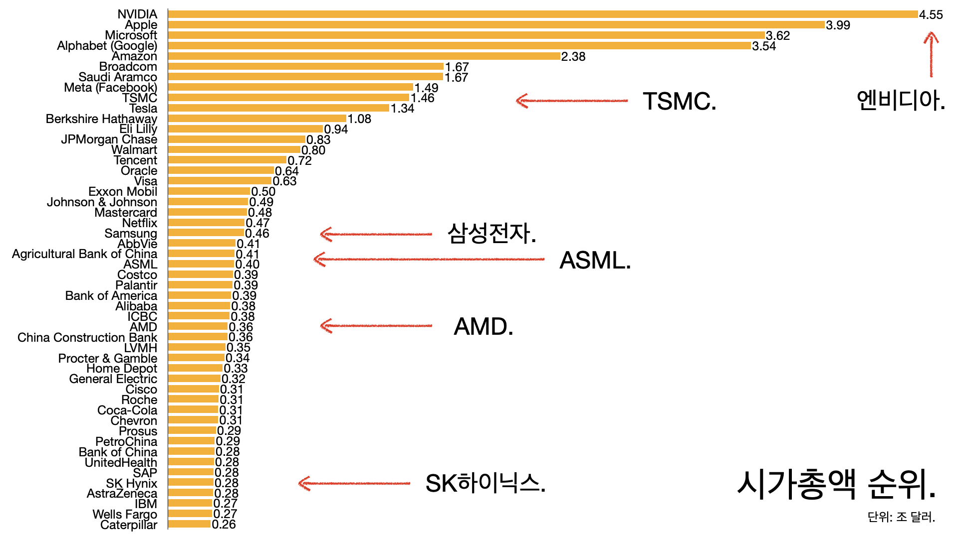 - 엔비디아 시가 총액이 5조 달러를 넘겼다가 꺾인 상태다.