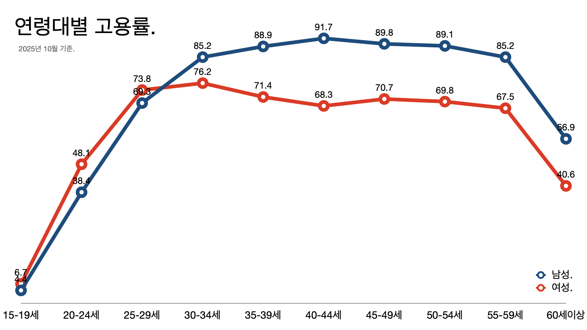 - 지난 25년 추이를 보면 전체적으로 고용률이 늘었지만 M형 커브의 골짜기가 뒤로 옮겨갔다는 사실을 확인할 수 있다.