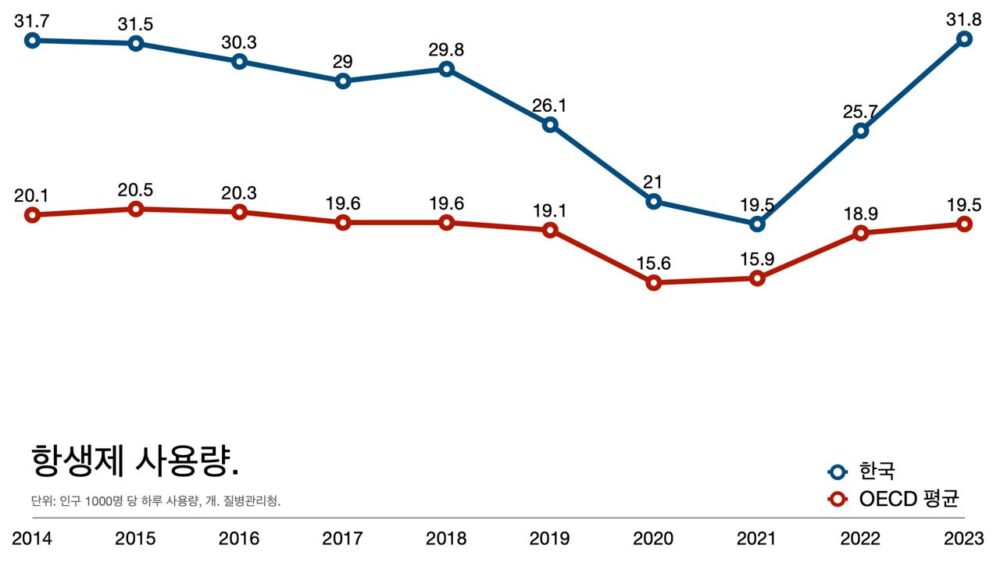 - 항생제 만능주의가 조용한 팬데믹으로 이어질 수 있다는 우려가 나온다. 한국의 하루 항생제 사용량은 인구 1000명당 32개다. 1위는 튀르키예 41개다.
