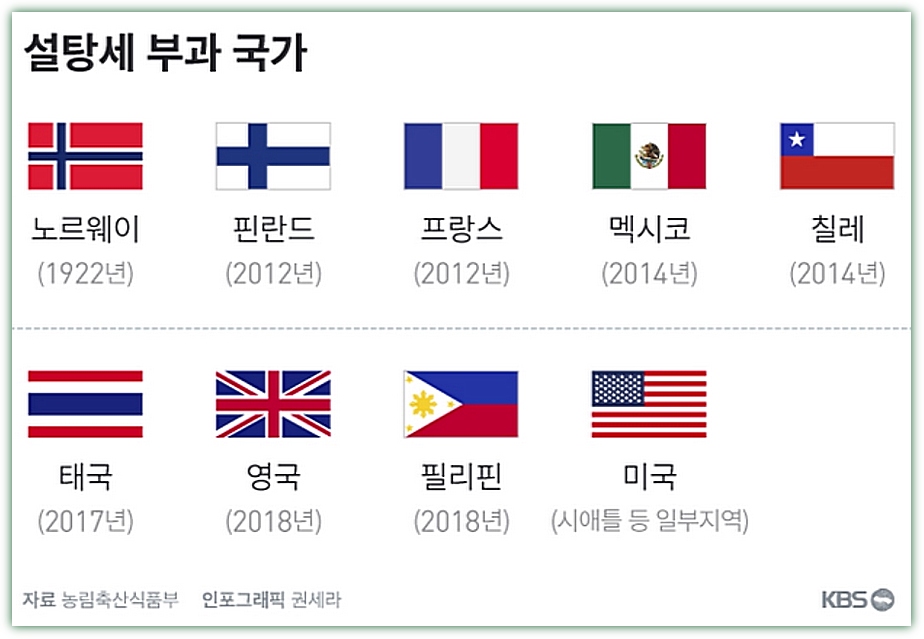 - 영국은 2016년에 설탕세를 도입했는데 이번에 기준을 더 높였다. 지금은 100ml 기준으로 5g 이상 설탕이 들어가면 18펜스(350원), 8g 이상이면 24펜스(460원)의 설탕세를 부과하고 있다.