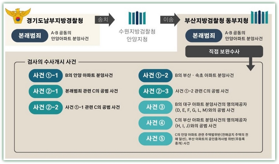 경기도남부지방경찰청은 안양 소재 아파트 분양과 관련하여 A와 B를 주택법 위반(거짓이나 부정한 방법으로 주택을 공급받거나 공급받게 하여 공동주택 공급질서를 교란하는 ‘부정수급’의 점)과 업무방해(주택재개발정비조합, 건설회사 등이 공정하게 수분양자를 선정하는 업무를 방해한 점) 혐의로 수사하여 2020. 2. 26. 수원지방검찰청 안양지청에 사건을 송치하였습니다. 이후 안양지청은 2020. 3. 26. 이 사건을 A와 B의 주소지인 부산지방검찰청 동부지청으로 이송하였습니다.