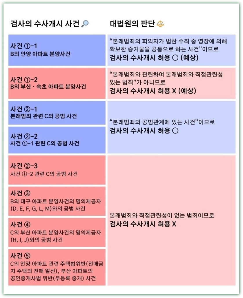 한편, B가 상고하지 않아 판단되지 않았지만, 사건①-1(B의 안양 아파트 분양사건)은 ‘본래범죄의 피의자가 범한 수죄 중 영장에 의해 확보한 증거물을 공통으로 하는 사건’으로서 수사개시가 허용되지만, 사건①-2(B의 부산ㆍ속초 아파트 분양사건)은 “본래범죄와 관련한 인지한 본래범죄와 직접 관련성이 있는 범죄”가 아니어서 수사개시가 허용되지 않았을 것입니다.