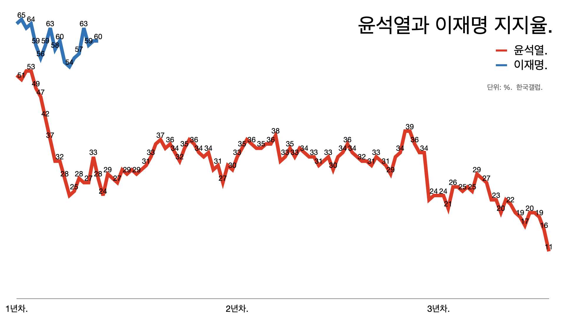 - 윤석열(전 대통령)은 박근혜(전 대통령)보다 낮았다. 각각 17%와 12%다.