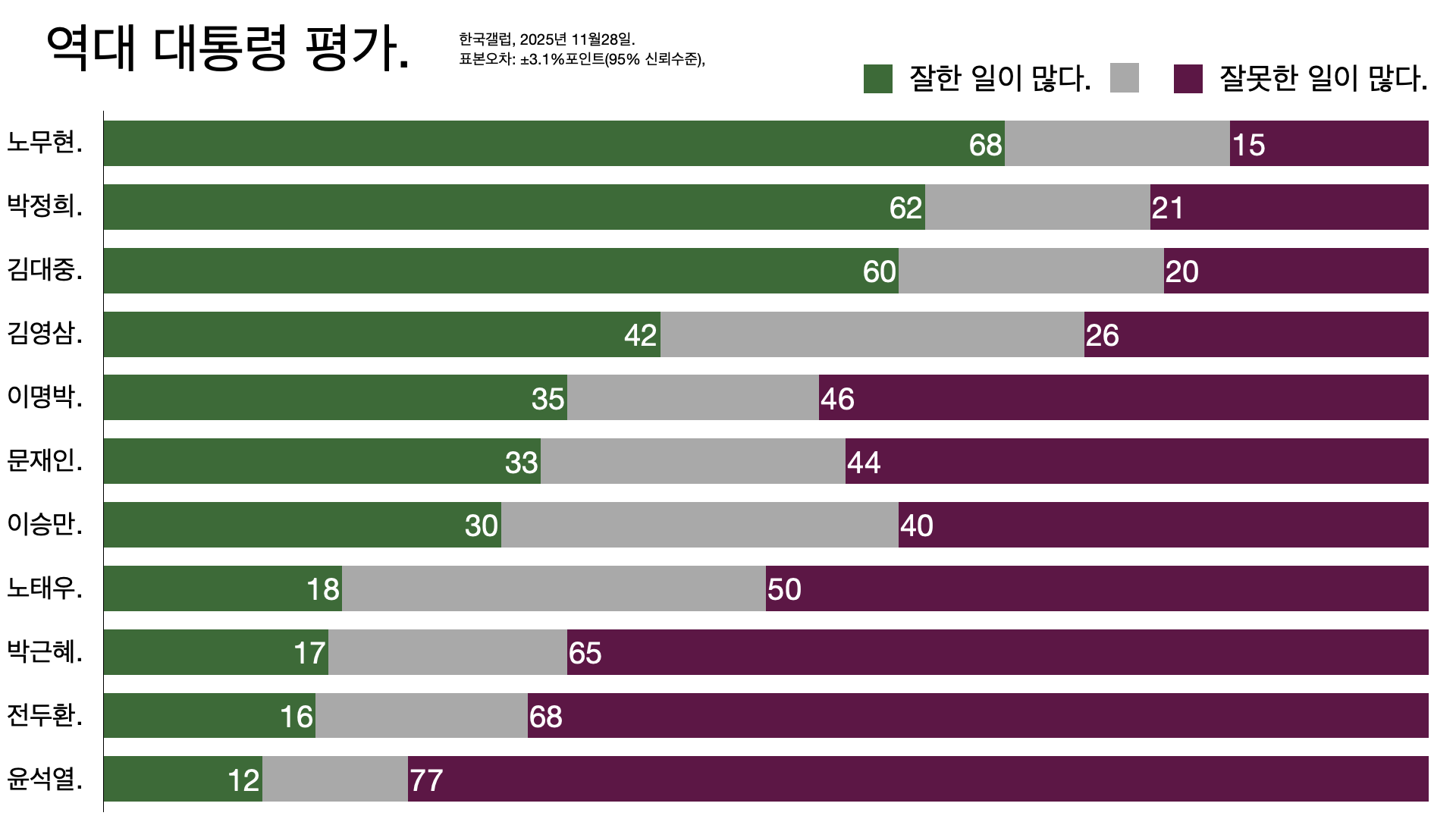 - 한국갤럽의 역대 대통령 평가는 여러가지 튀는 부분이 많다. 일단 노무현(전 대통령)이 “잘한 일이 많다”에서 68%로 1위다. 박정희(전 대통령)가 62%로 2위인 것도 놀랍다.