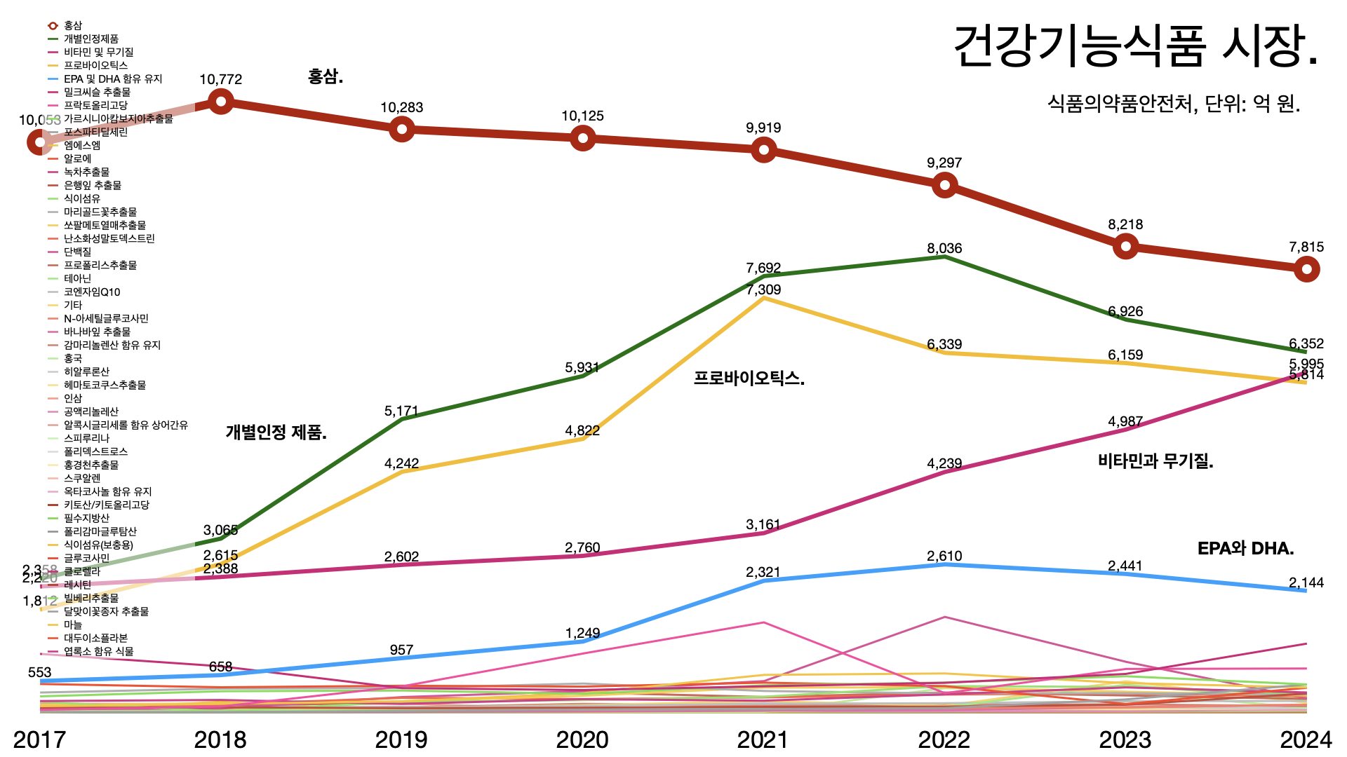- 비중은 줄었지만 여전히 홍삼이 1위입니다.