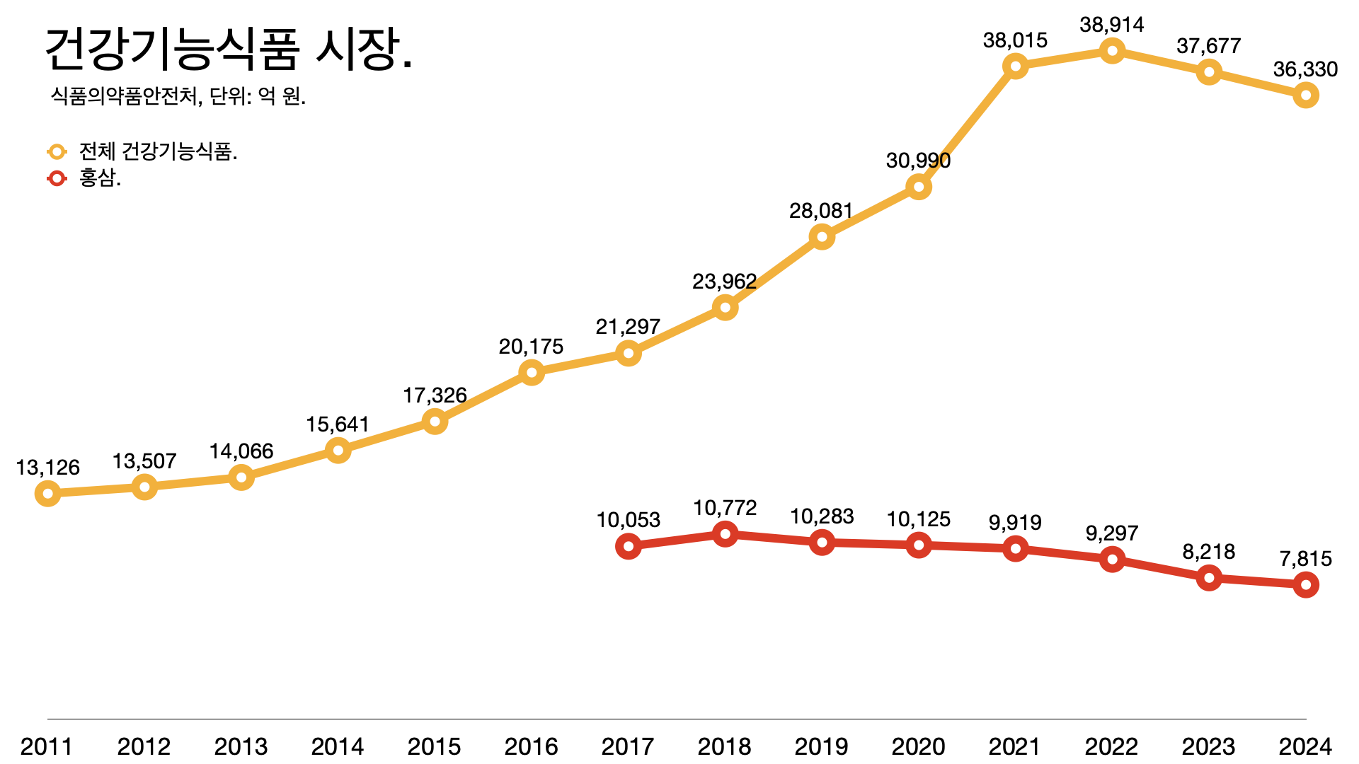 - 건강기능식품 시장은 2011년 1조3126억 원에서 2022년 3조8914억 원까지 늘었다가 지난해 3조6330억 원을 기록했다. 홍삼만 놓고 보면 2018년 1조772억 원에서 지난해 7815억 원까지 줄어든 상황이다.