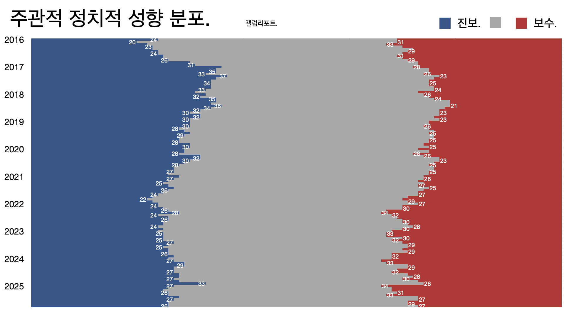 - 비상계엄 직후 스스로를 진보 성향이라고 보는 응답자가 33%까지 치솟았다가 떨어졌고 탄핵 국면에서는 스스로를 보수라고 보는 유권자가 34%까지 올랐다가 떨어졌다. 11월 기준으로 진보와 보수가 각가 26%와 27%로 줄었다.