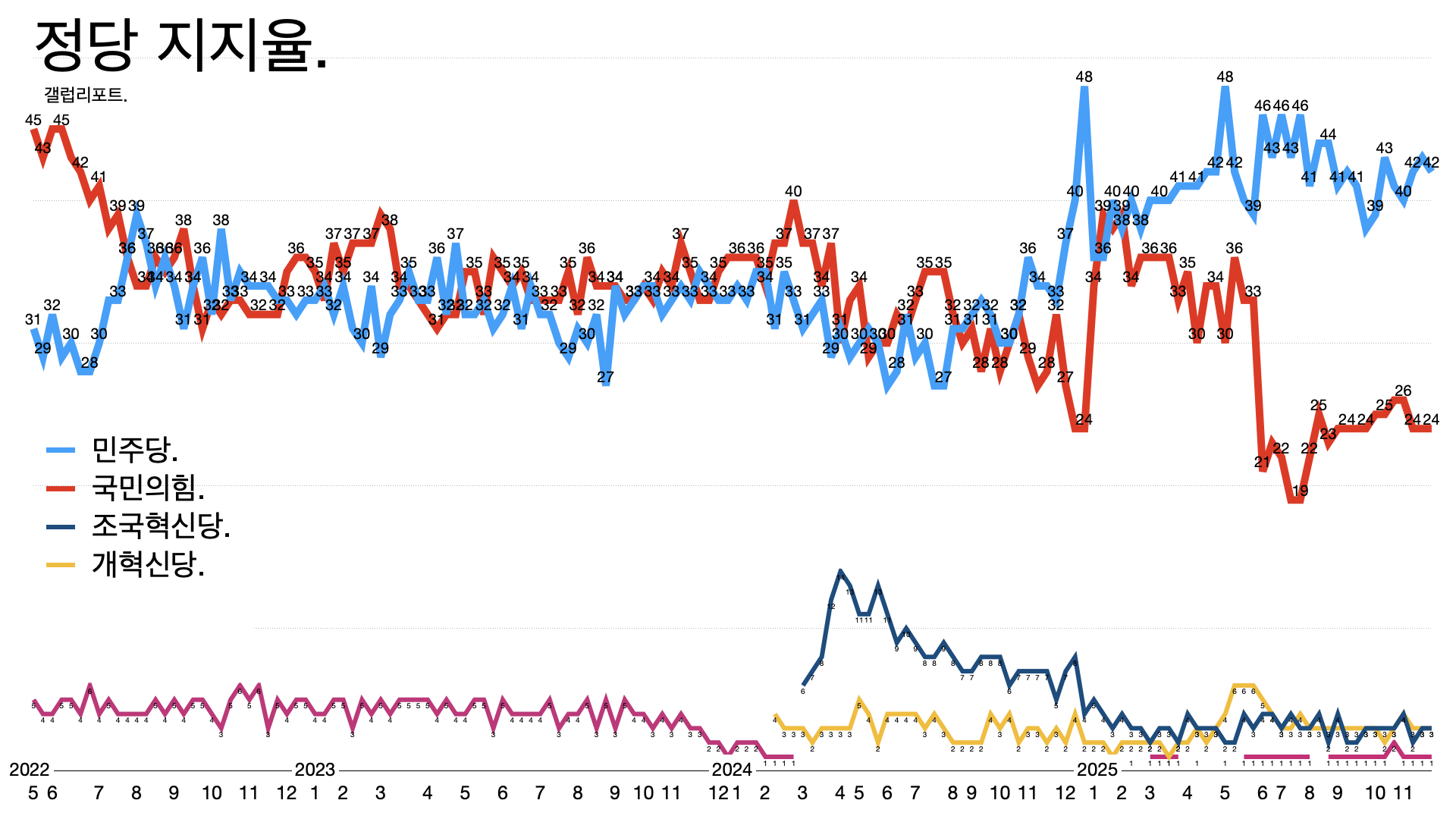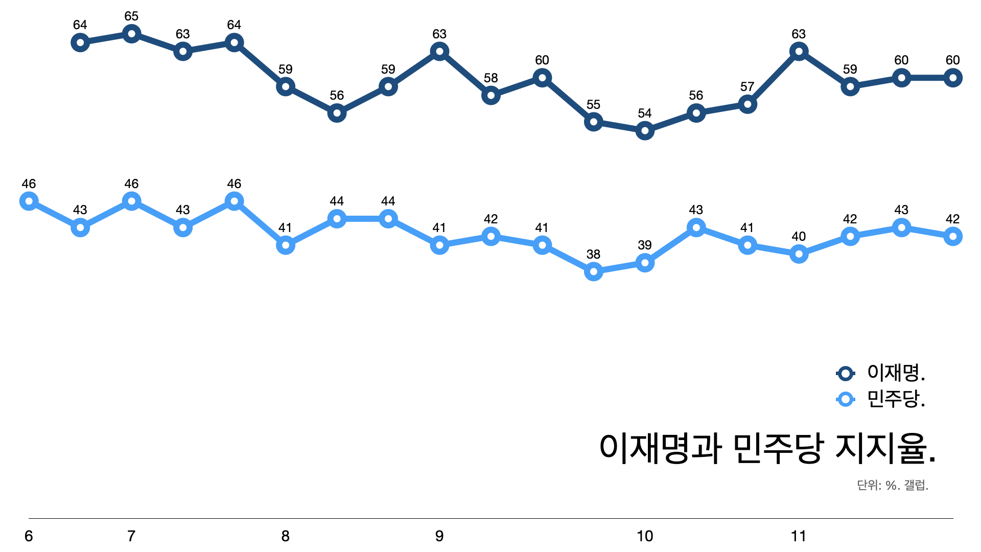 - 11월 넷째주 한국갤럽 조사 결과 이재명(대통령) 지지율은 60%를 지키고 있고 민주당은 42%에 그쳤다.