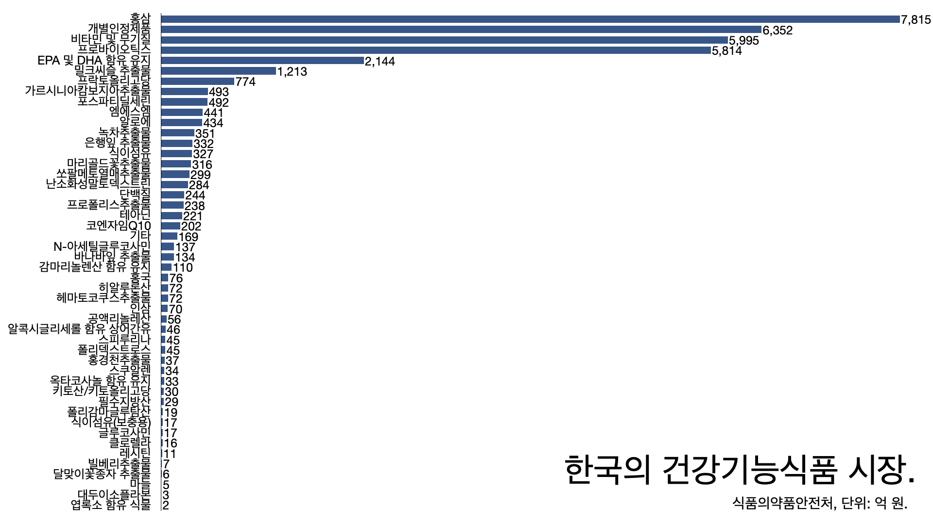 - 지난주 금요일 인용한 건강기능식품 관련 통계는 한국건강기능식품협회 자료인데, 식품의약품안전처 데이터와 차이가 있습니다. 아무래도 업계 자료보다는 정부 공식 자료가 좀 더 공신력이 있을 테니 다음과 같이 수정하겠습니다.