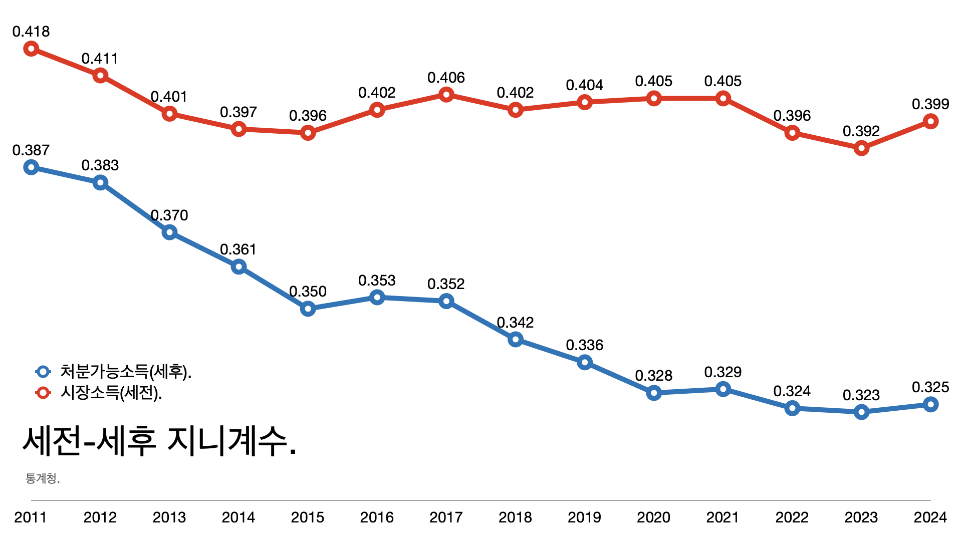 - 불평등 정도를 나타내는 지니계수는 시장 소득 기준으로 0.323에서 0.325로 올랐고 처분 가능 소득 기준으로는 0.392에서 0.399로 올랐다. 지니계수는 1에 가까울수록 격차가 크다는 의미다.