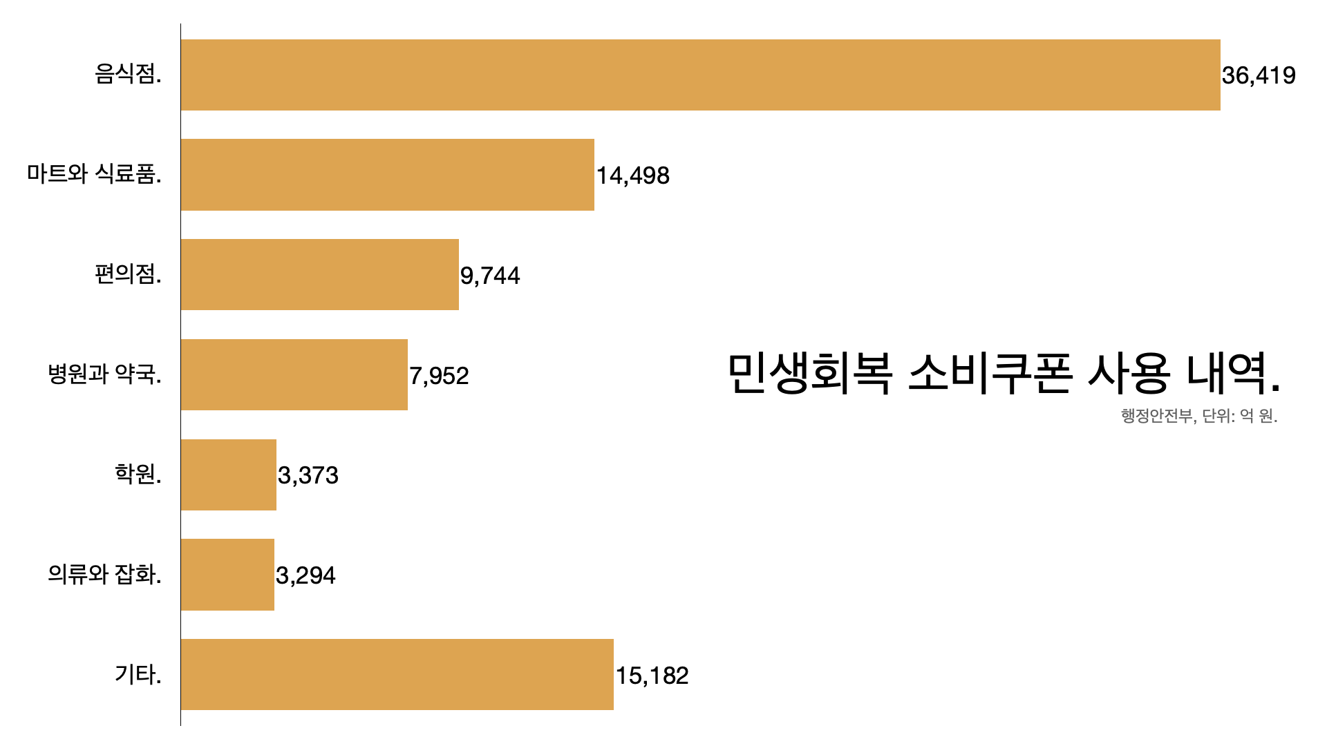 - 9조668억 원이 나갔고 99.8%를 썼다. 음식점이 50%, 마트와 식료품점이 16%, 편의점이 11%다.