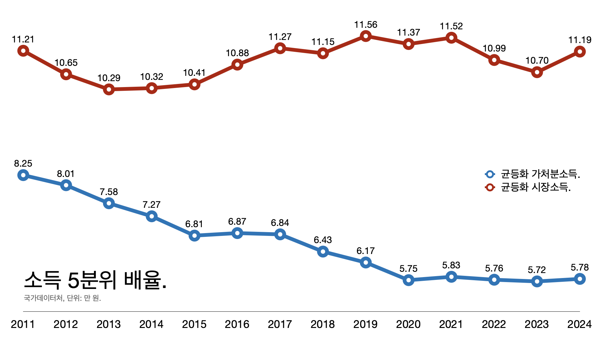 - 소득 5분위 배율도 균등화 시장 소득 기준으로 10.7배에서 11.2배로, 가처분 소득 기준으로 5.7배에서 5.8배로 늘었다.