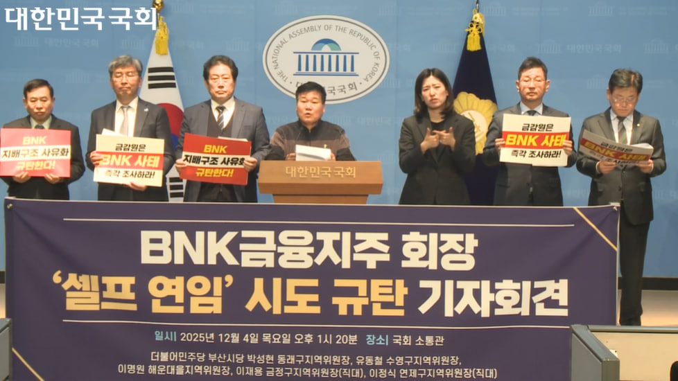 민주당 부산지역 원외 위원장, 지역 시민사회, 부울경(부산·울산·경남) 의원들은 4일 오전 국회 소통관에서 기자회견을 열었다. “현 빈대인 회장이 자신이 임명한 사외이사들로 구성된 임원추천위원회(임추위)를 통해 연임을 추진하면서 BNK 금융의 지배구조 공정성을 심각하게 훼손하고 있다”는 것이다. 절차 중단과 임추위 해체를 주장했다.