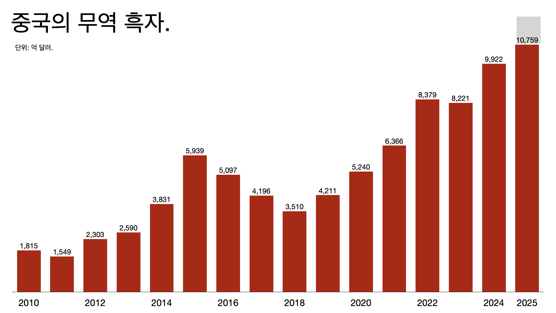 - 올해 들어 11월까지 누적 무역 흑자가 1조759억 달러다. 어느 나라도 도달한 적 없는 규모다. 지난해는 9920억 달러였다.