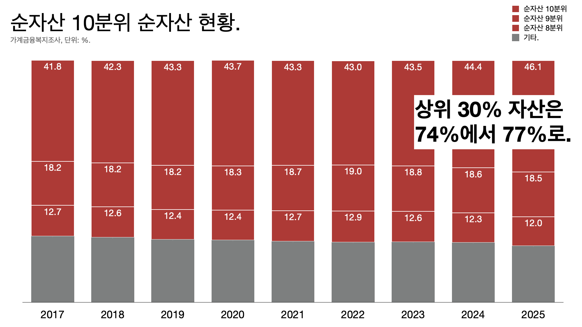 - 상위 10%가 순자산의 46%를 차지하고 있다.
