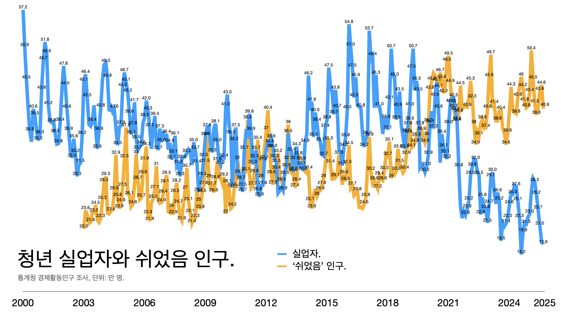 - 실업자는 줄었지만 ‘쉬었음’ 인구가 늘고 있다. 15~29세 ‘쉬었음’ 인구는 사상 최고 기록을 깨고 있다.