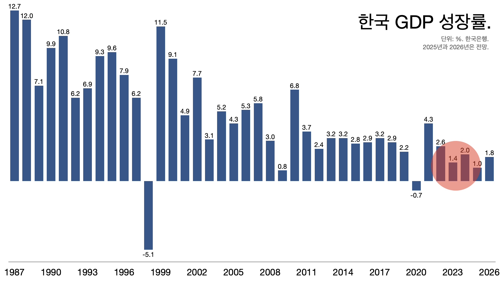 - 해방 이후 한국 역사에서 1% 미만 성장률은 다섯 번 있었다. 1980년 1998년 IMF와 2009년 글로벌 금융위기와 2020년 코로나 팬데믹, 그리고 윤석열이다.